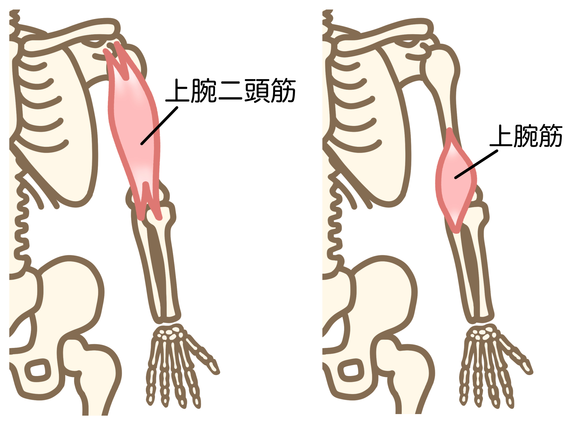 外からは分かりにくい存在ですが、肘を曲げる動作の主役ともいえる重要な筋肉です。
